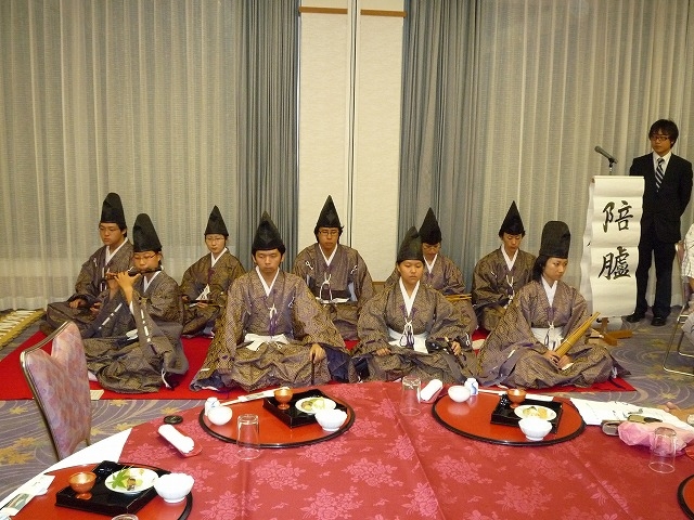 9月19日(日)の前夜祭では、KKRホテルビワコで行われ、参加者を「雅楽演奏」でお迎えしました。今回は、初めての試みとして「同志社雅楽会」11名の皆さんに生演奏を披露していただきました。