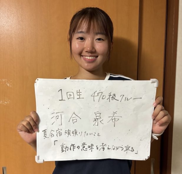 夏合宿では、毎朝のトレーニングに丁寧に取り組み、体力と筋力の強化に努めたいと考えています。また、来週には、新人戦も控えています。初めてレースに参加するため、得られるものがたくさんあると思います。自分のことで精一杯になってしまうとは思いますが、少しでも周りを見て自ら学び、今後の上達への手がかりを見つけたいと思います。