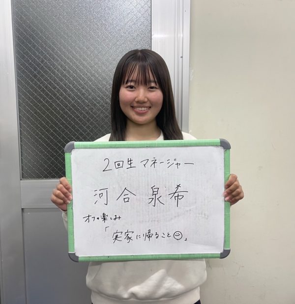 私は、この春合宿からマネージャーに転向しました。当然のことながら、これまでとは全く異なる活動内容となるため、慣れることから始めなければなりませんでした。この春合宿で何か完全に達成したことがあるかと言われれば、残念ながら難しいと思います。レスキューボートの運転や練習運営、成績分析の仕事も任せていただきましたが、まだまだ課題があり、先輩や同期マネージャーに助けてもらってばかりです。しかしながら、プレイヤーの役に立ちたい、チームの目標であるインカレ総合優勝に貢献したいという気持ちは、誰よりも強く持っているつもりです。一日でも早く、チームにとって役に立つマネージャーとなり、これから入部してくる新1回生に目標としてもらえるようなマネージャーになれるよう、精進していきます。