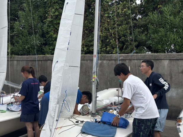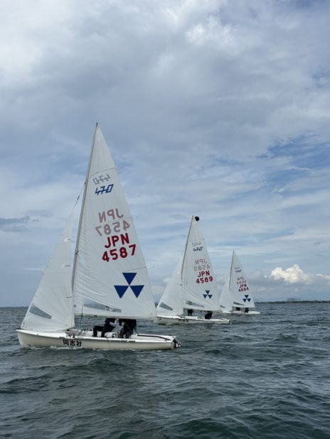 本日は3-5m/sの風の中、1レースが行われました。雷が鳴り、2レース目、3レース目はスタートしたものの途中でノーレースとなりました。最初は三井寺の風でしたが北風に周り、風向、風速共に大きく変化し、それに順応することが求められました。明日は全艇が前を走れるように艇とペアでの準備を進めてまいります。