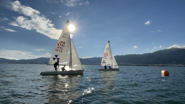 唐崎では2-4m/sの風の中、両クラス共に帆走練習、マーク回航、スタート練習、コース練習を行いました。マーク回航とスタート練習では少ない艇数の中でも混戦を作り、実戦を意識しながら取り組みました。今クール残り1日、一人一人がレベルアップできるよう集中して取り組んでまいります。