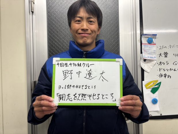 私がヨット部に入部を決意したきっかけは、一つ上の西内先輩の存在です。初めてお会いした際、立ち振る舞いや言動から伝わる圧倒的な存在感と、周囲への気遣いを怠らない姿に強く惹かれました。ただ競技力に優れているだけでなく、人としても尊敬を集める姿に触れ、自分もこのような人間になりたいと思ったことが、入部を決めた大きな理由です。