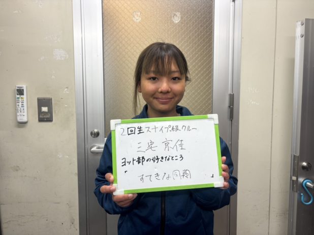 私の入部理由は、高校生の時に同志社大学体育会ヨット部を見学させていただいた際の雰囲気に強く惹かれたためです。全日本インカレ総合優勝という一つの目標に向かって、部員全員が同じ方向を向き、努力している姿に大きな魅力を感じました。