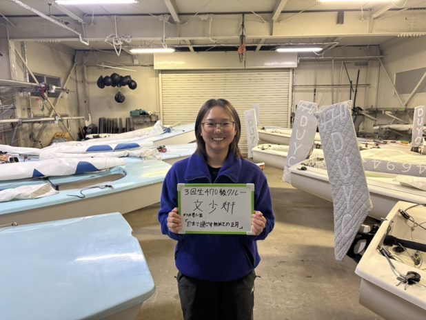 また、個人的な目標としては、「チームの1番艇として470チームの優勝に貢献すること」を掲げています。全日本インカレで常に上位フィニッシュすることはもちろん、日々の練習の中で自分の技術を周囲へ還元し、470チーム全体のレベルアップに寄与できるよう努めてまいります。