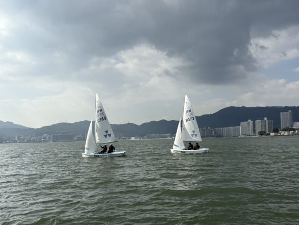 本日は1-5m/sの風の中1レースが行われました。午前はオーバーコンディションから約4knotまで1レース間で風が変化し、その中で上手くシフトとブローを噛めるよう意識してレースを進めました。風が落ち一度着艇した後もう1レース行われましたが、ノーレースとなりました。代交代後初の団体戦となるこのレースで、明日は同志社が全艇前を走れるよう取り組んでまいります。